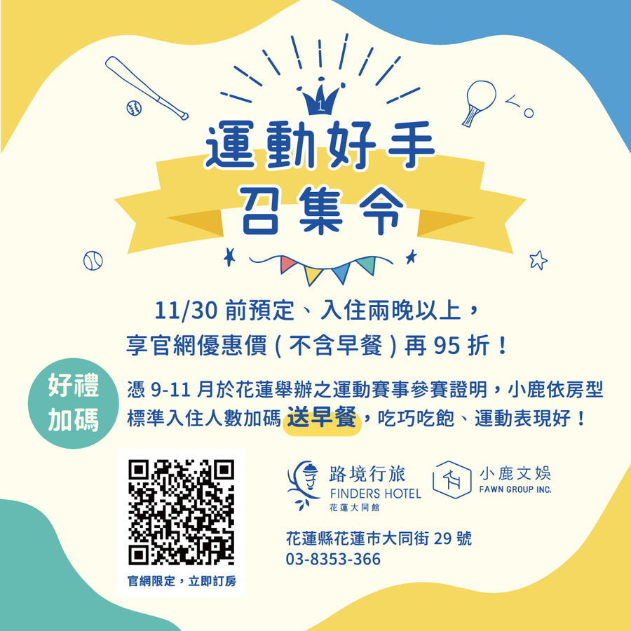 憑9-11月於花蓮舉辦之運動賽事參賽證明,小鹿依房型標準入住人數加碼送早餐,吃巧吃飽、運動表現好!