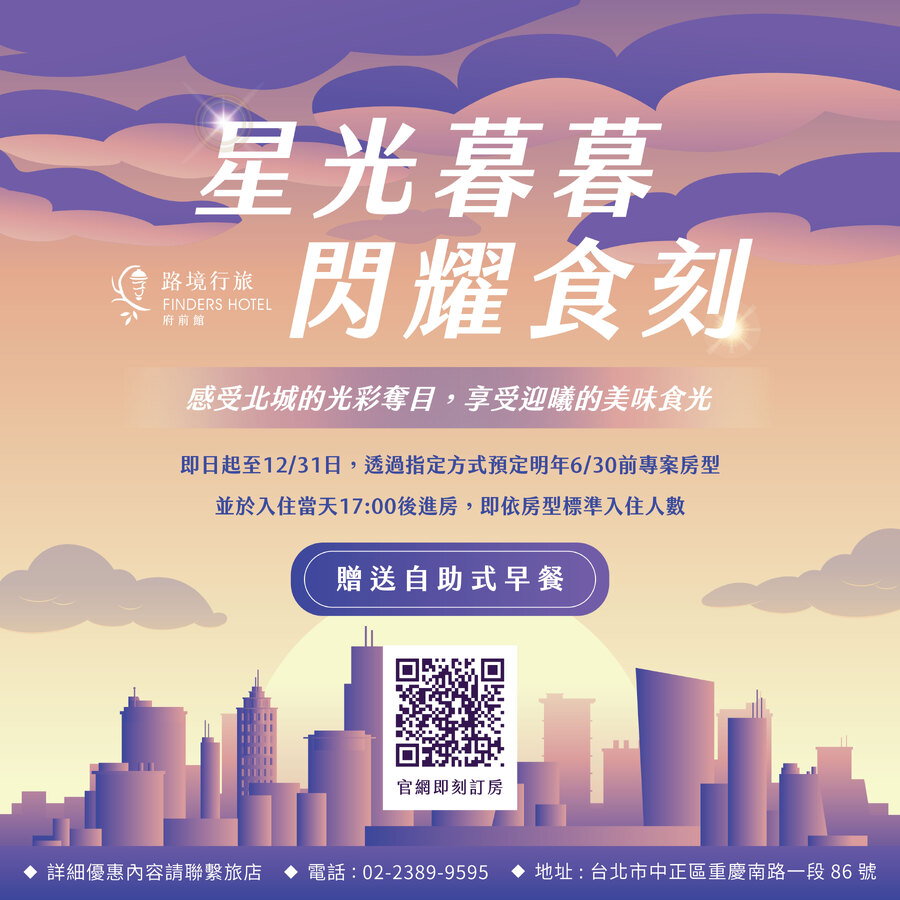 即日起至12/31日,透過指定方式預定明年6/30前專案房型,並於入住當天17:00後進房,及依房型標準入住人數【贈送自助式早餐】!