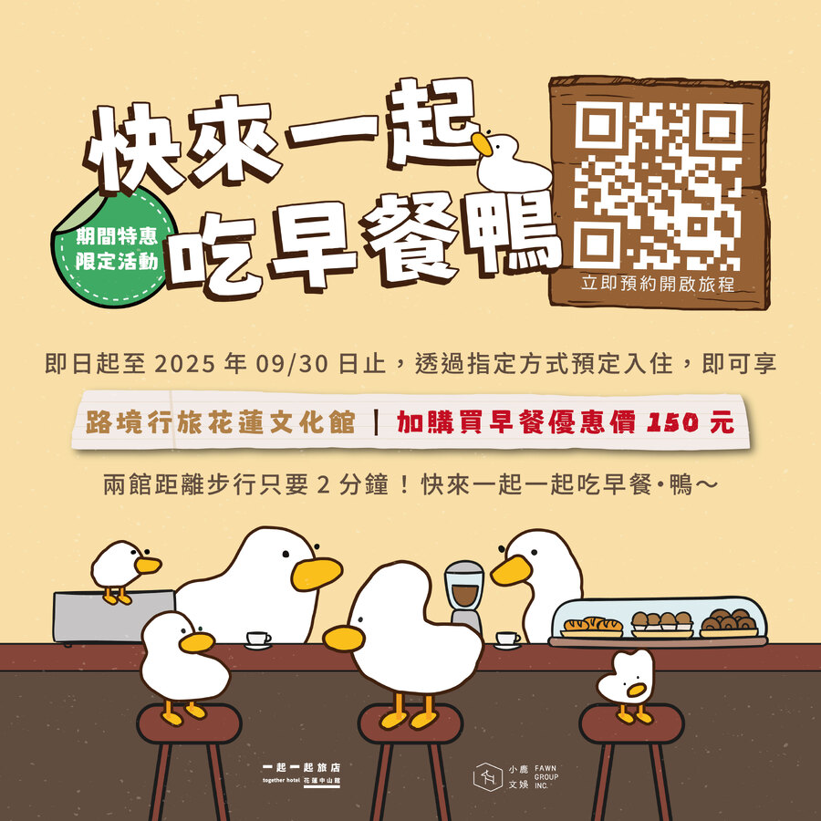 • 本館無提供早餐服務,享用早餐地點需至「路境行旅花蓮文化館」憑券兌換。