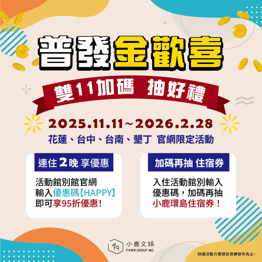 #小鹿文娛 #金歡喜 #全民普發金 #一萬元 #雙11優惠 #加碼 #國旅優惠 #旅店住宿 #旅宿優惠 #花蓮住宿 #台中住宿 #台南住宿 #墾丁住宿 #環島住宿券